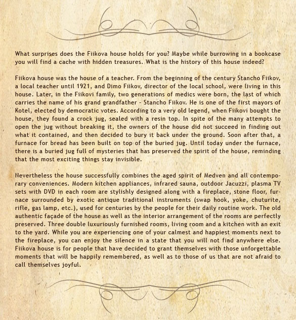 Additional services: Jacuzzi (included in the price), Sauna (included in the price), Wi Fi (included in the price), Massages , Walk with a cart, Picnic, Picking of herbs, mushrooms, walnuts, Home canning, Ochestra (traditional Bulgarian songs and dances) - traditional dance lessons, Hunting, Fishing, Natural landmarks' marathons/long walks, Horseback riding, Rock climbing and cave visiting, A visit in the house-museum of Zahari Stoqnov, A walk in Jeravna, Kotel and other landmarks.